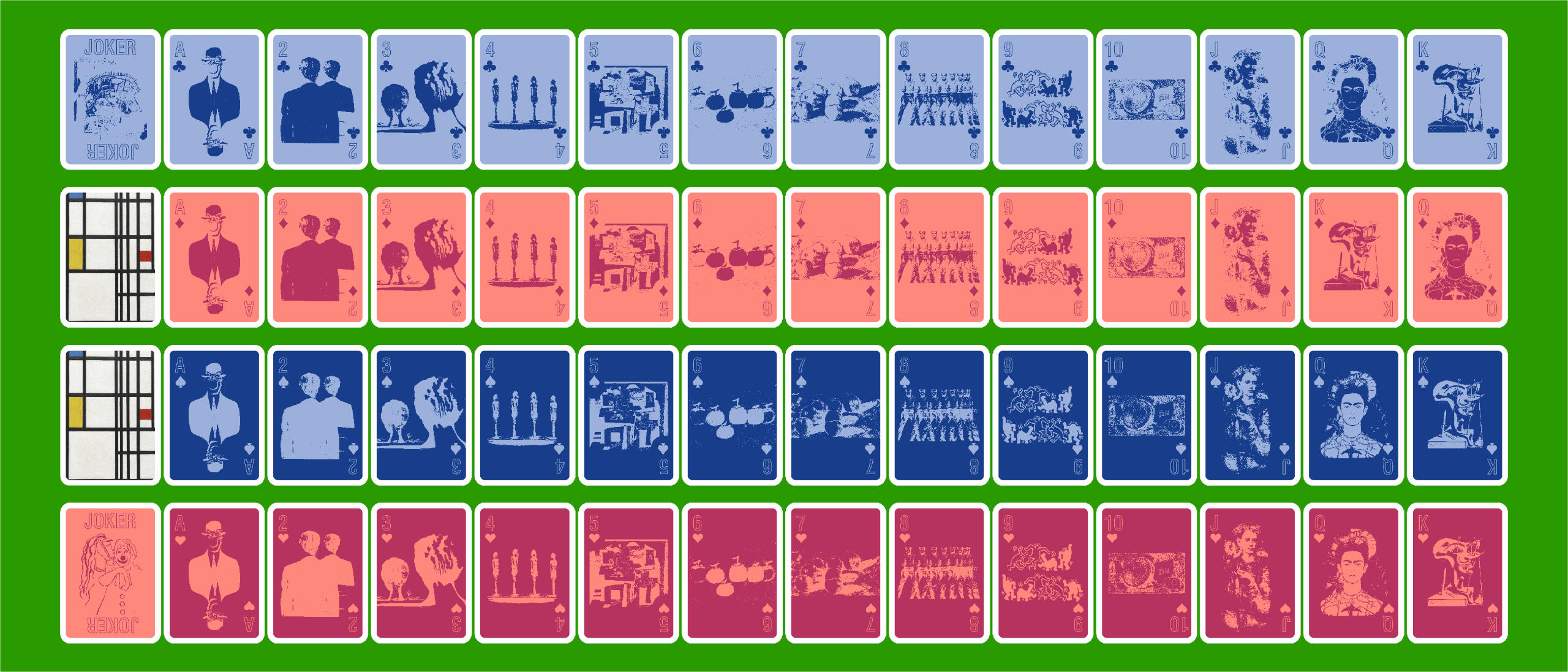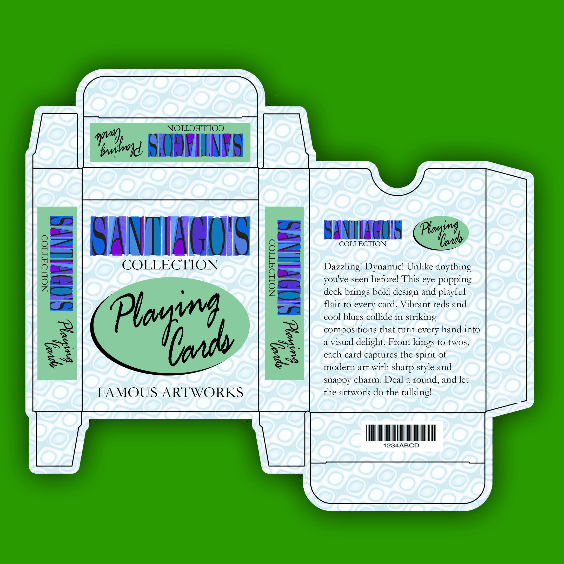 This Santiago’s Collection project features a fully illustrated 54-card deck inspired by famous artworks and filtered through a bold, modern pop art lens. Each card transforms a well-known piece of art into a surreal, two-tone visual, using vibrant red and blue gradient overlays to build a cohesive, eye-catching style across the entire set. The numbered cards cleverly align with the subject matter—matching card values to visual elements in the artwork—creating a subtle but playful storytelling device throughout the deck.The design maintains traditional card structure while embracing modern experimentation with symmetry and color blocking. Royal face cards feature iconic figures like Frida Kahlo and René Magritte, rendered in simplified posterized forms for a punchy, expressive look. The jokers and custom back design further the deck’s identity, while the packaging echoes mid-century commercial style with energetic typography and vintage tones. Together, the set captures the essence of fine art with the charm of collectible design.