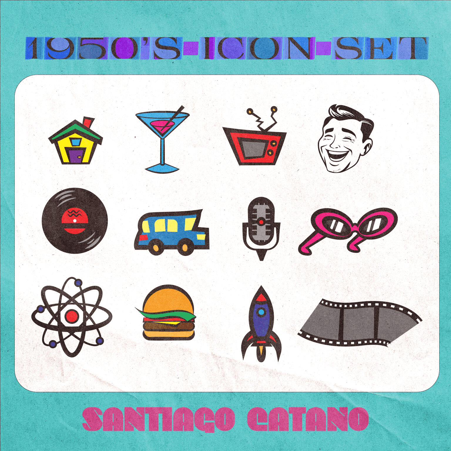 This icon collection was created in Adobe Illustrator and is inspired by the bold, playful aesthetic of 1950s pop culture. Each of the 12 icons captures a recognizable symbol from the era, including elements like a retro TV, record player, rocket ship, and atomic symbol. The set was designed with a cohesive visual language—featuring thick outlines, vintage textures, and a bright, limited color palette—to ensure clarity and unity. These icons are fully vector-based, making them scalable for both print and digital use. The layout highlights their versatility while evoking the nostalgic charm of mid-century design.