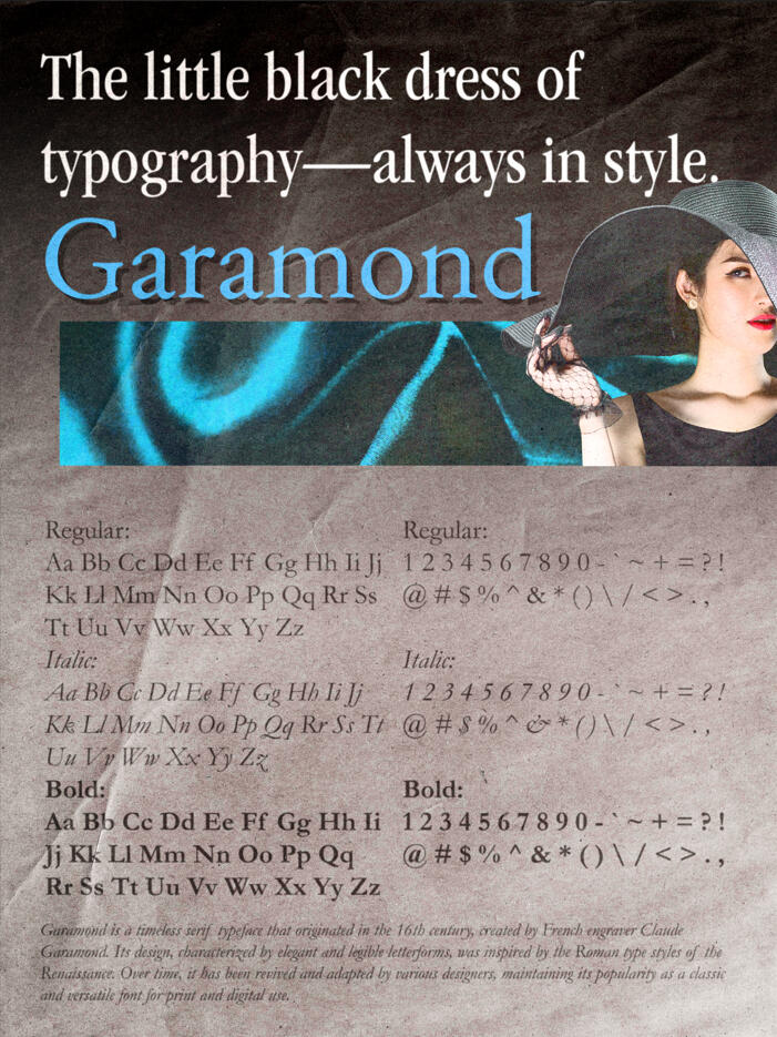 This project explores the timeless elegance of Garamond through a typographic showcase designed for an 18" x 24" poster format. The goal was to visually communicate Garamond’s classic appeal while maintaining strong typographic hierarchy and clarity.The poster presents the typeface in three distinct styles—regular, italic, and bold—along with a full character set including numerals, punctuation, and symbols. To enhance the aesthetic and reinforce the concept of Garamond as “the little black dress of typography,” I paired the refined letterforms with a high-fashion editorial visual theme. The background features rich textures, subtle gradients, and a silk-like fabric to evoke luxury and timeless sophistication.