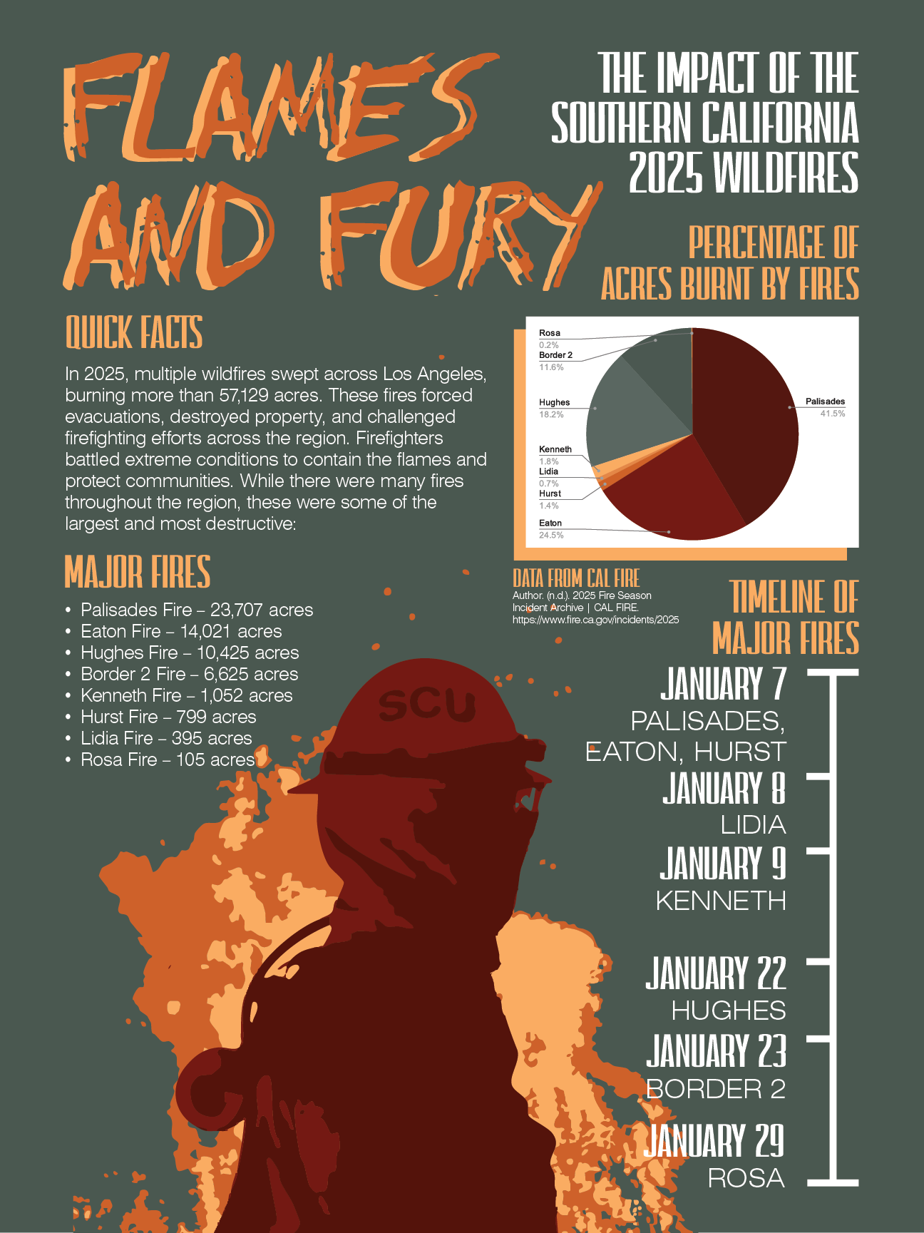 This infographic visualizes the devastating impact of the 2025 Southern California wildfires through a dynamic, data-driven layout. The objective was to present complex information in a clear, engaging, and emotionally resonant format.